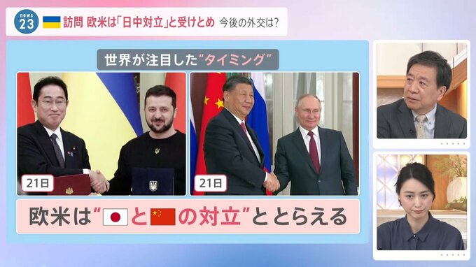 一方で世界が注目したのはこのタイミングなんですね。岸田総理とゼレンスキー大統領が会談したのと同時刻に、ほぼ同時刻に、プーチン大統領と習近平主席が会談をしたということで、欧米では日本と中国がウクライナ戦争を巡って対立しているんだという評価として捉えられているんですね。