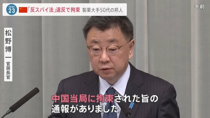 「反スパイ法」違反で… 製薬会社の幹部社員が拘束