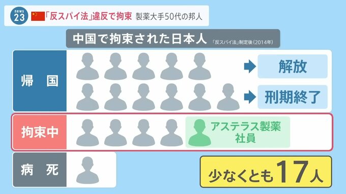 中国は2014年に「反スパイ法」を制定。スパイ活動の取り締まりを強化してきました。2018年には大手商社の男性社員が拘束されるなど、これまでに少なくとも17人の日本人が“スパイ活動”にかかわったとして拘束されました。