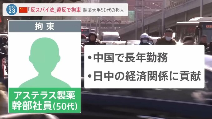 政府は中国の北京市で3月、日本人男性が中国当局に拘束されたことを明らかにしました。拘束されたのは「アステラス製薬」の50代の幹部社員。中国での勤務歴が長いベテランで、日中の経済関係に貢献した人物だったといいます。