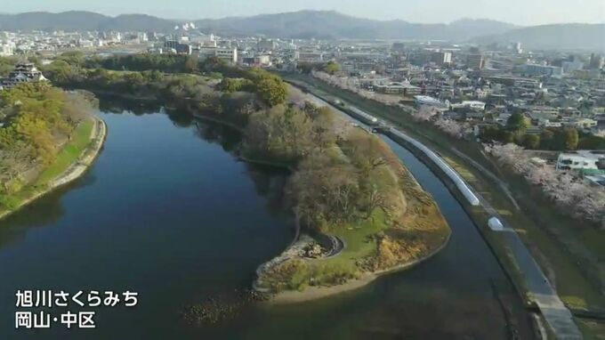 ピンク色の鮮やかな花びらが満開を迎えています。岡山市中心部の旭川河川敷では植えられたソメイヨシノが見ごろを迎えています。