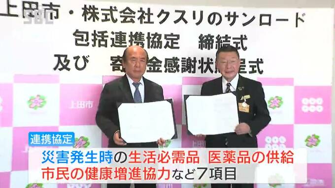 県内でドラックストアなどを展開する企業と上田市が、災害時の支援や健康増進などで連携する協定を結びました。上田市と協定を結んだのは県内と山梨県でドラッグストアなどを展開する「クスリのサンロード」で、27…