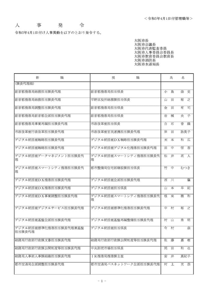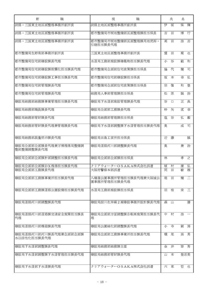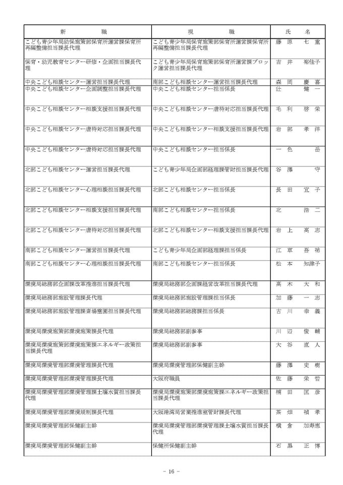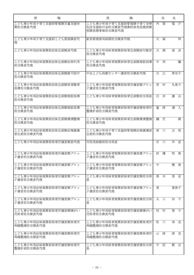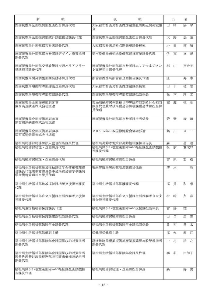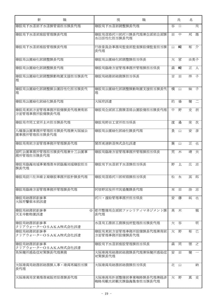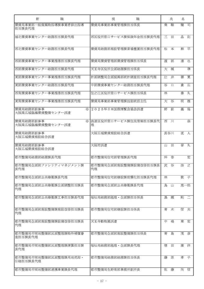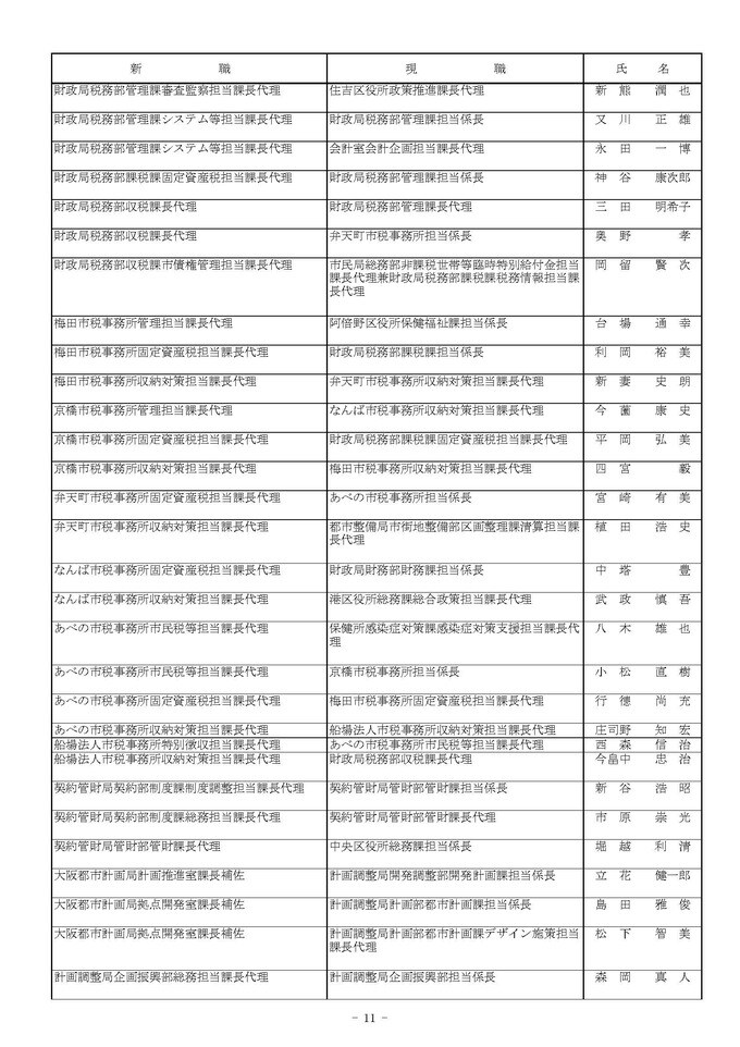 課長代理級の人事異動(大阪市発表資料より)