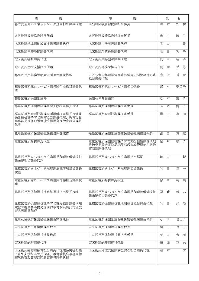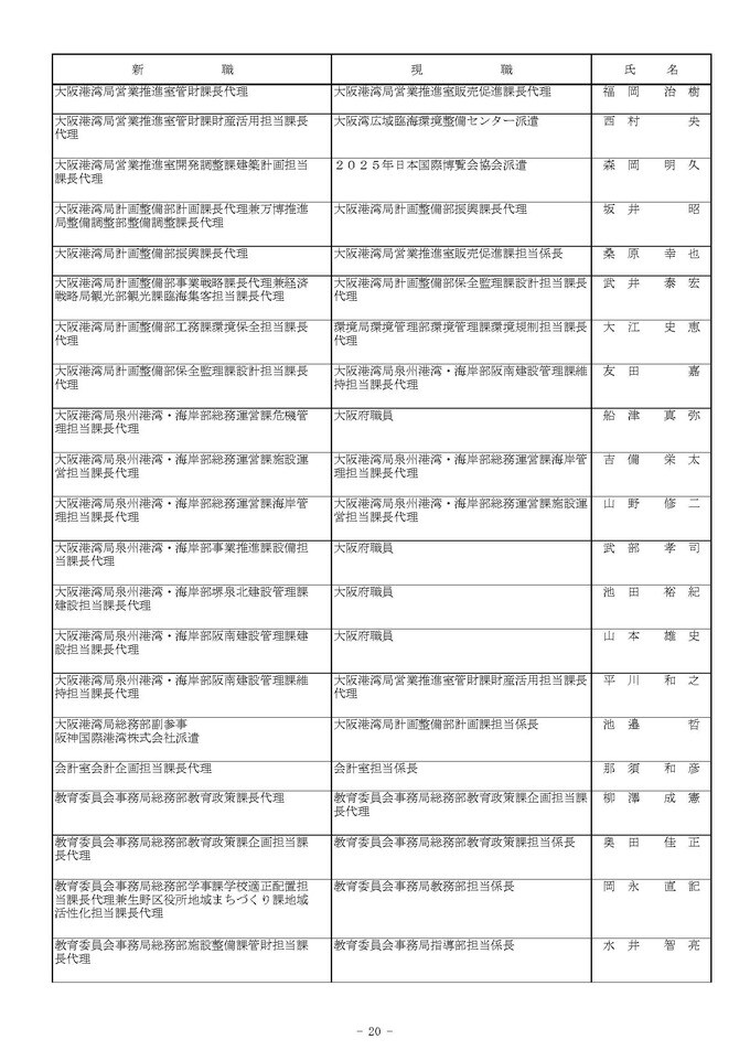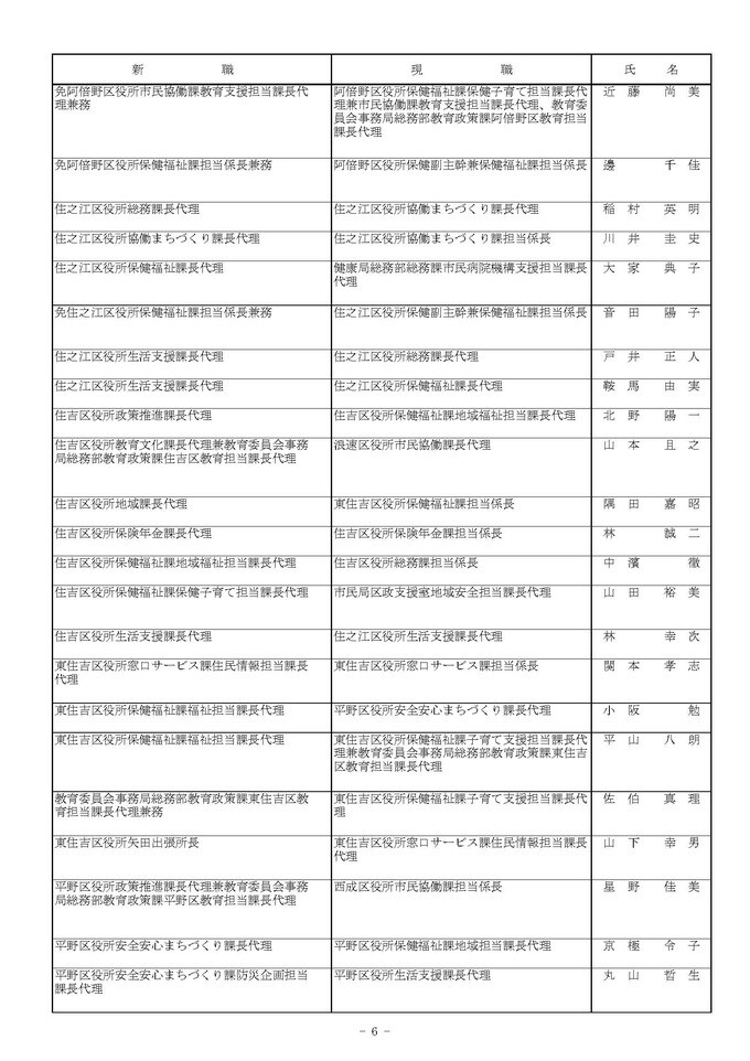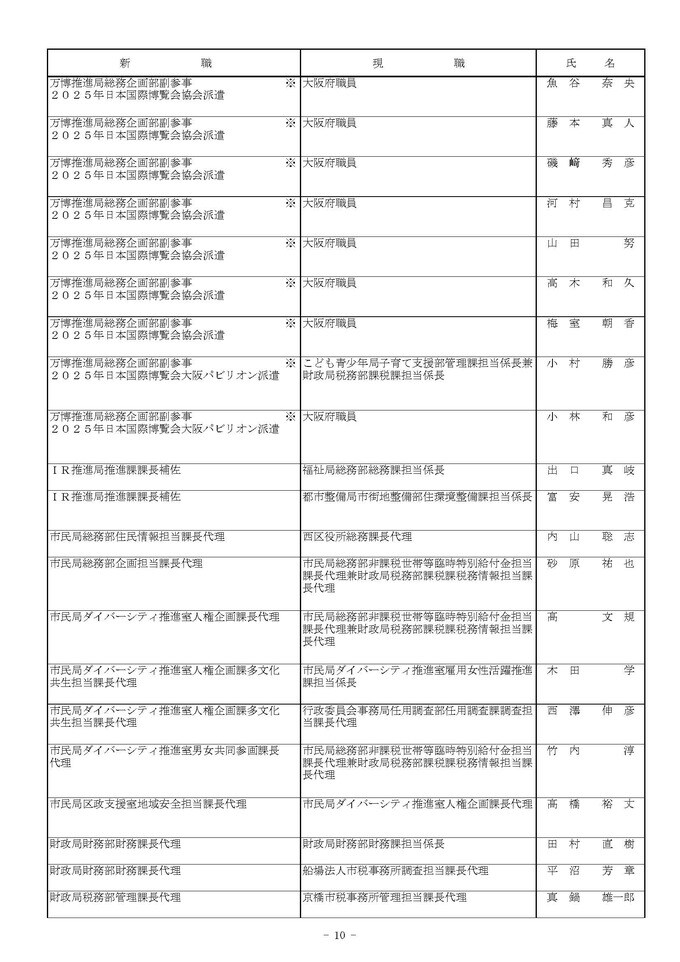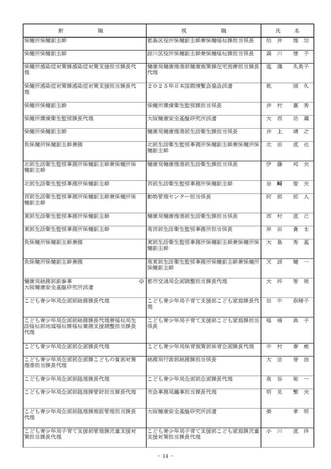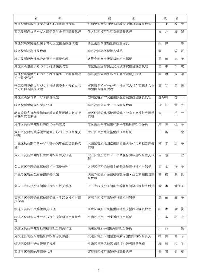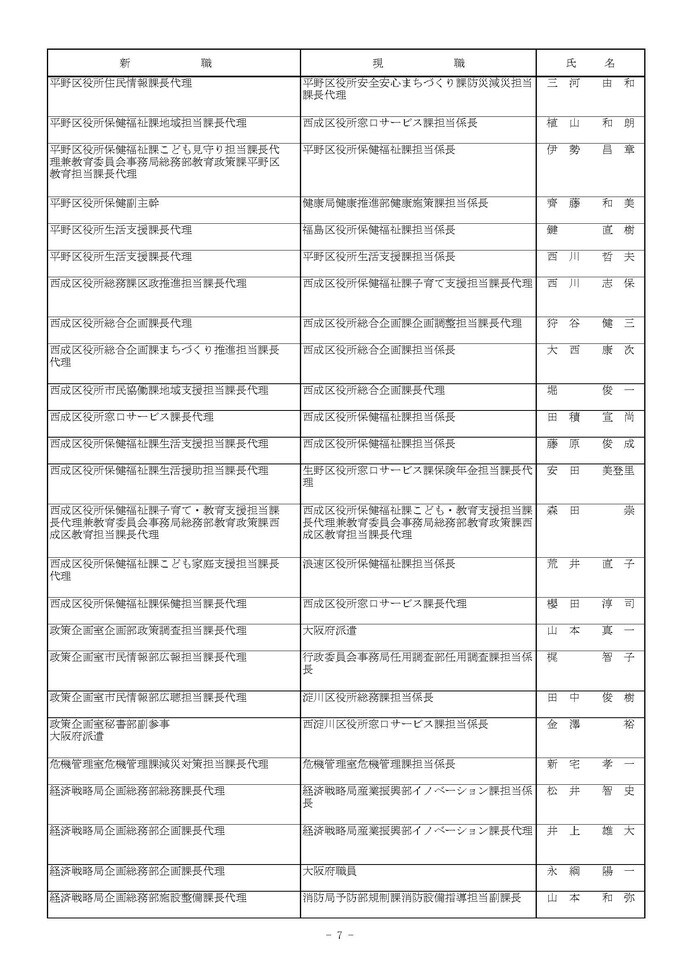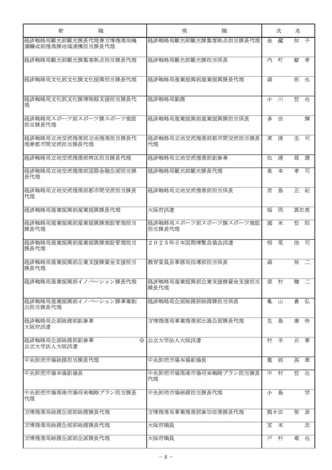課長代理級の人事異動(大阪市発表資料より)