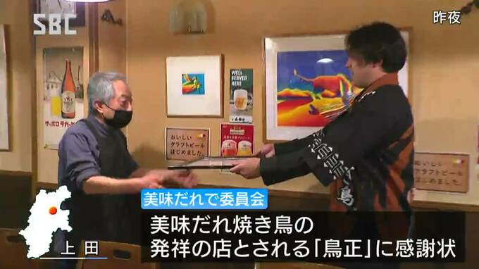 美味だれ焼き鳥が今年度(2022年度)の「100年フード」に認定されたことを受け、飲食店の有志などでつくる「美味だれで委員会」が27日夜、発祥の店といわれる上田市の「鳥正(とりまさ)」に感謝状をおくりました。
