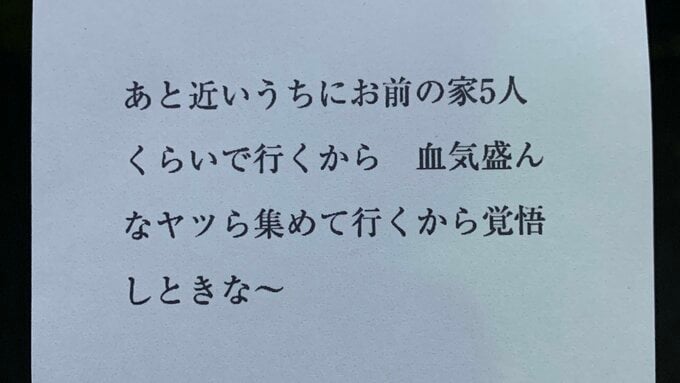自宅に届いた脅迫状には「血気盛んなヤツら集めて行くから覚悟しときな」と書かれていた。
