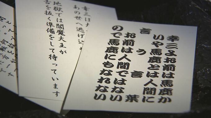 自殺勧告状と題し、「外を歩く際はくれぐれも気をつけて」と脅すもの。「いますぐ死ね。死ね死ね死ね死ね」「死刑が正しい道筋である」「言葉の喋れるゴキブリ」という罵詈雑言。「害虫はコロナにかかって死にやがれ」「中国政府の戦車にひかれて死んでほしい」「ミャンマーの軍事政権に殺されてまえ」という荒唐無稽なものもあった。
