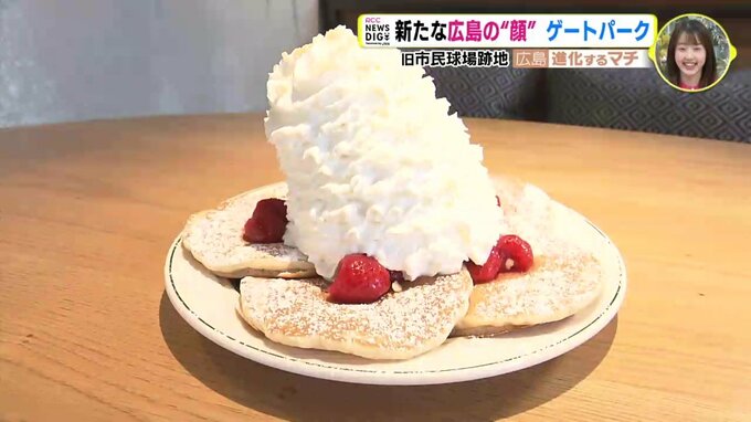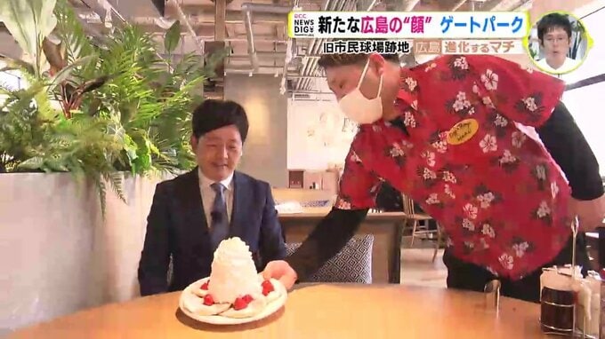 「広島初出展のお店『Eggs’n Things SHIMINT HIROSHIMA』です。看板には『ハワイ』と書いてありますね。ハワイ発祥のお店で、ハワイの朝食を食べさせてもらえるということです。入ってみましょう」