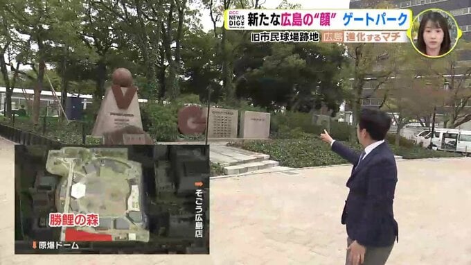 「こちらが、日本シリーズやセントラル・リーグの広島カープ優勝記念碑『勝鯉の森』ですね。カープのまさに聖地なわけですけども。そのすぐ目の前にあるこちらをご覧ください」