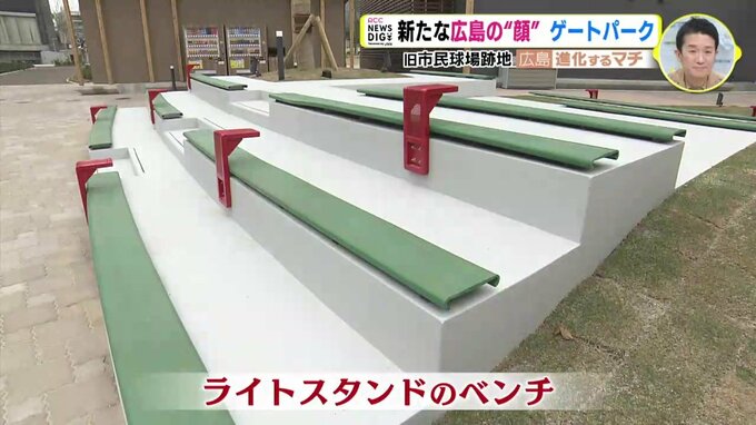 「覚えていますか、みなさん? カープの旧市民球場のライトスタンドのあのベンチが、ここに移設されているんですよ。あの立ったり座ったりのスクワット応援がよみがえってくるような…、こんな感じでしたよね」
