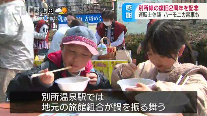 復旧から2周年となる28日は、スマートフォンアプリの「チケットQR」で乗車した場合、運賃が終日無料になったほか、別所温泉駅では地元の旅館組合が鍋を振る舞いました。