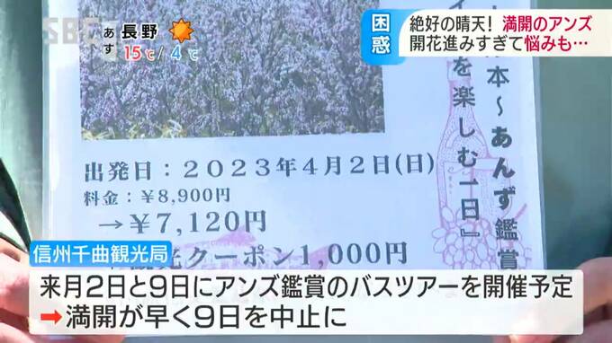 「来月9日はバスツアーとしてはお越しいただくのは厳しいかなと思うんですが、あんずの里は広くて、山の上の方はまだアンズをきれいに見ていただけると思う。アンズの製品など楽しんでいただいて、近くの桜なども見ていただけるとよいと思います」