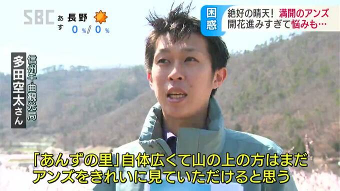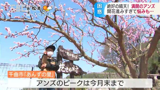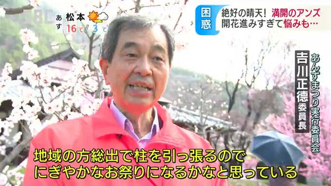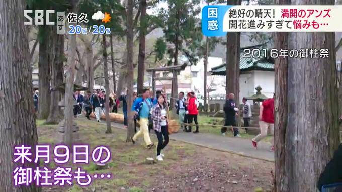さらに、従来ならアンズの花が彩る中で曳行してきた地元の神社の御柱祭も、今年は4月9日の予定で、花がそれまで持つかどうか、関係者は気をもんでいます。