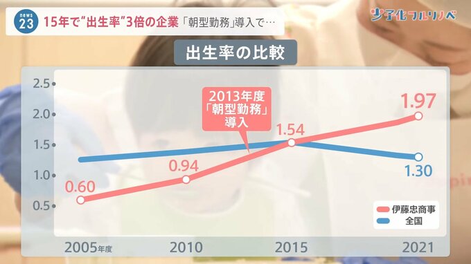 2005年度から2021年度の全国の出生率をみると、1.3前後とほぼ横ばいです。これに対し、伊藤忠の女性社員の出生率は2005年度の0.60から、朝型勤務の導入などで1.97と、3倍以上までに増えました。