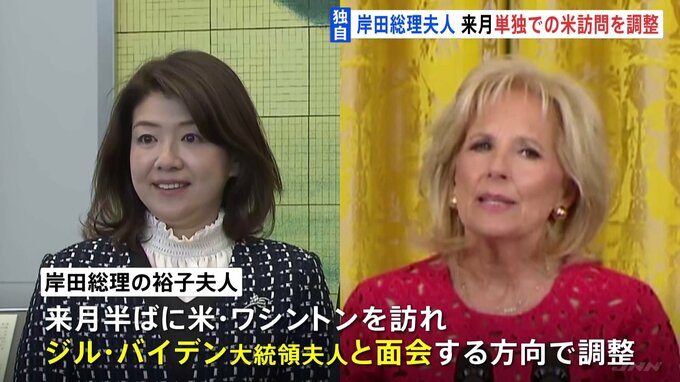 岸田総理の妻・裕子夫人が来月、アメリカのホワイトハウスを訪問し、バイデン大統領のジル夫人と面会する方向で調整していることがJNNの取材で明らかになりました。日本の総理夫人が単独でアメリカを訪問するのは…