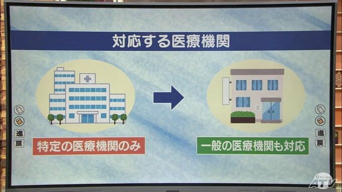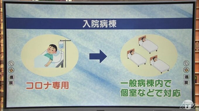 大きく変わるのは対応する医療機関です。これまでの特定の医療機関のみ、から一般の医療機関への対応も求めていきたいとしています。マスクや消毒といった感染対策はこれまで通りですが、入院病棟についてはコロナ専用病棟を設ける必要はなく、一般病棟の中で感染が拡大しないように個室やコロナ患者のみを同じ病室にすることとしていて、青森県では4月中にも対応をまとめる予定です。