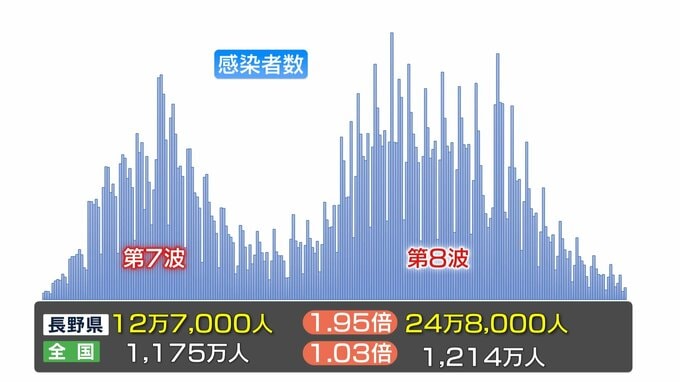 第8波での感染者は、全国が1200万人前後で第7波とほぼ同じだったのに対し、長野県は第7波の倍近い、およそ25万人が感染しました。