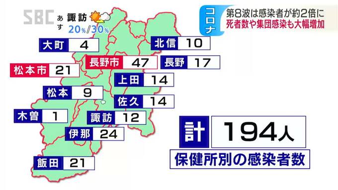 一方、きょう公表された県内の感染者の数は194人で、保健所別では長野市が47人、松本市が21人、県が管轄する伊那が24人、飯田が21人などでした。