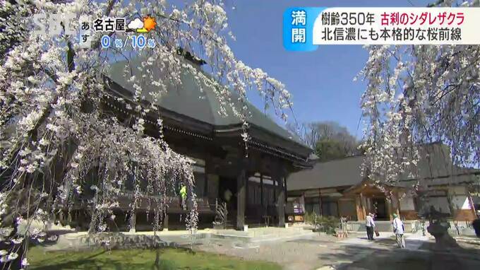 長野市篠ノ井小松原の光林寺(こうりんじ)では樹齢およそ350年のシダレザクラが満開に。