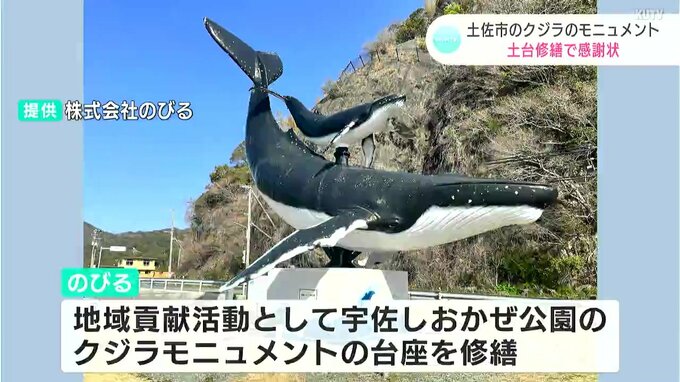 高知県土佐市の宇佐大橋の修繕工事を担当した高知市の塗装会社が、地域貢献として、宇佐しおかぜ公園にあるクジラ像の台座を修繕し、市から感謝状が贈られました。土佐市から感謝状を贈られたのは、高知市の塗装会…