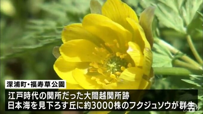 江戸時代の関所だった「大間越関所跡(おおまごしせきしょあと)」にある深浦町大間越の福寿草公園。日本海を見下ろす丘には約3000株のフクジュソウが群生しています。今年は雪どけが早く、いつもの年より10日ほど早く花を咲かせ見ごろとなっています。