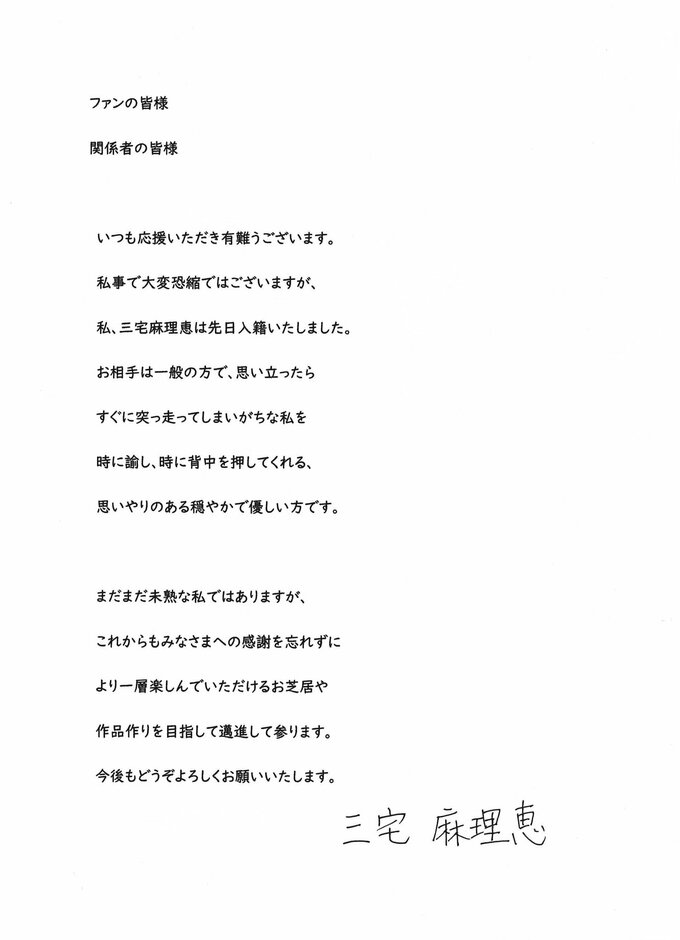 三宅さんはお相手について「思い立ったらすぐに突っ走ってしまいがちな私を時に諭し、時に背中を押してくれる、思いやりのある穏やかで優しい方です。」と明かし、「まだまだ未熟な私ではありますが、これからもみなさまへの感謝を忘れずに