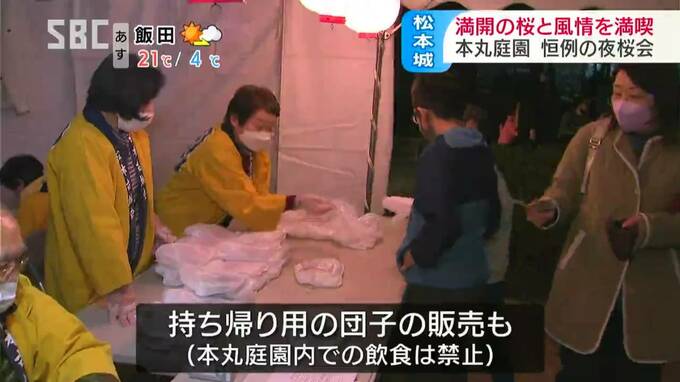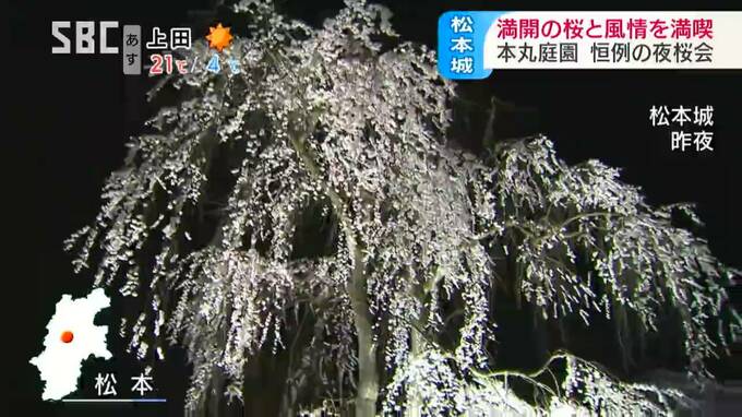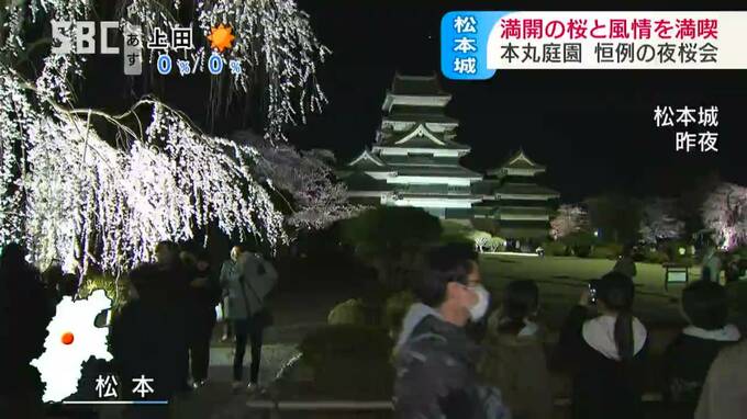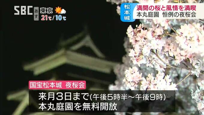 国宝松本城の夜桜会は4月3日までで、午後5時半から9時の間、本丸庭園が無料開放されます。