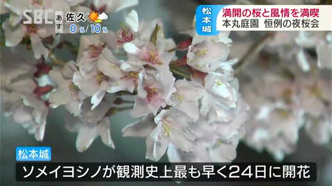 長野県内各地から桜のたよりが届く中、国宝松本城では、夜桜会が開かれ大勢の花見客で賑わっています。