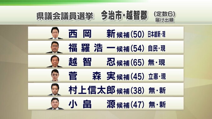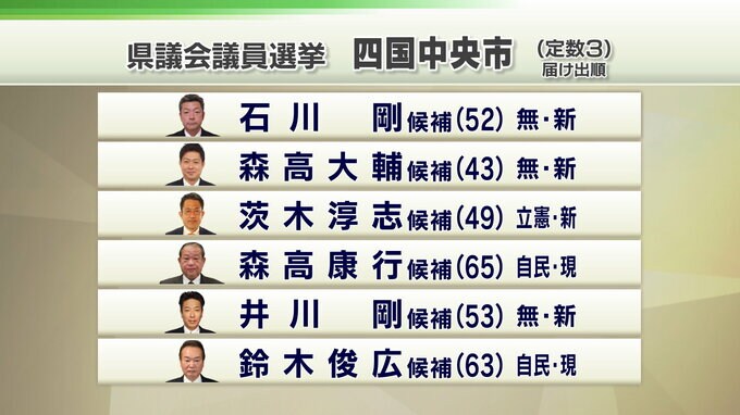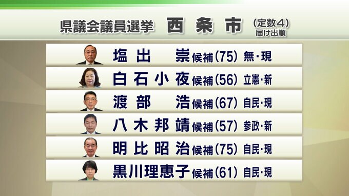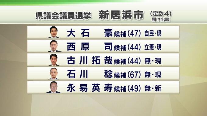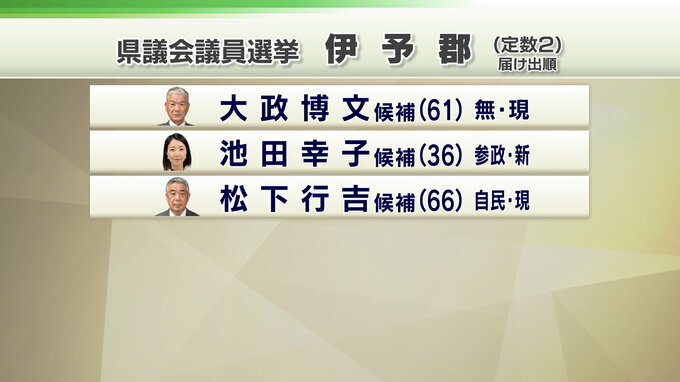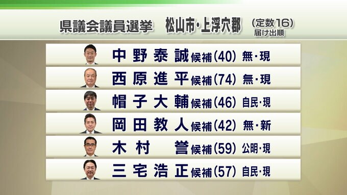 一方、選挙戦に突入したのは、四国中央市選挙区、新居浜市選挙区、西条市選挙区、今治市・越智郡選挙区、松山市・上浮穴郡選挙区、伊予郡選挙区、宇和島市・北宇和郡選挙区の7つです。
