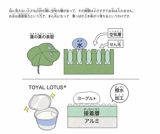 開発に15年。神頼みのおかげもあってか、今ではヨーグルトの約7割の蓋に「トーヤルロータス」が採用されている。東洋アルミニウムの調査によると、撥水加工なしでは内容量の4~10%が蓋についてしまうため、食品ロスの低減にも繋がっている。