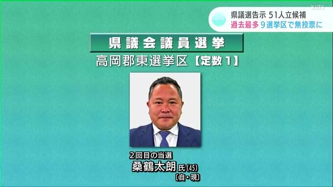 定数1の高岡郡東選挙区では自民党の現職桑鶴太朗(くわづるたろう)さんが2回目の当選です。