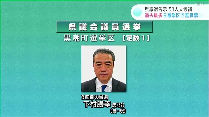 定数1の黒潮町選挙区では自民党の現職、下村勝幸(しもむらかつゆき)さんが3回目の当選です。