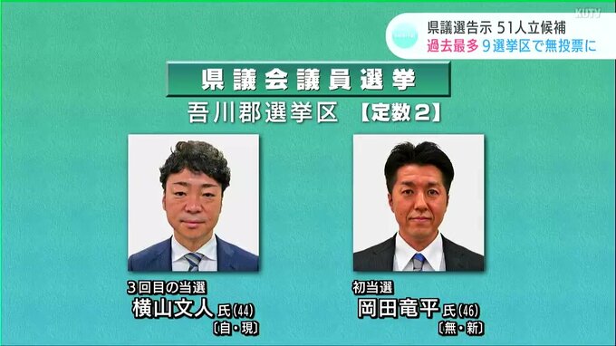 定数2の吾川郡選挙区では自民党の現職横山文人(よこやまふみと)さんが3回目の当選、無所属の新人岡田竜平(おかだりょうへい)さんが初当選です。