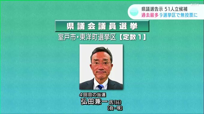 定数1の室戸市・東洋町選挙区では自民党の現職、弘田兼一(ひろたけんいち)さんが4回目の当選です。