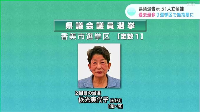 定数1の香美市選挙区では無所属の現職依光美代子(よりみつみよこ)さんが2回目の当選です。