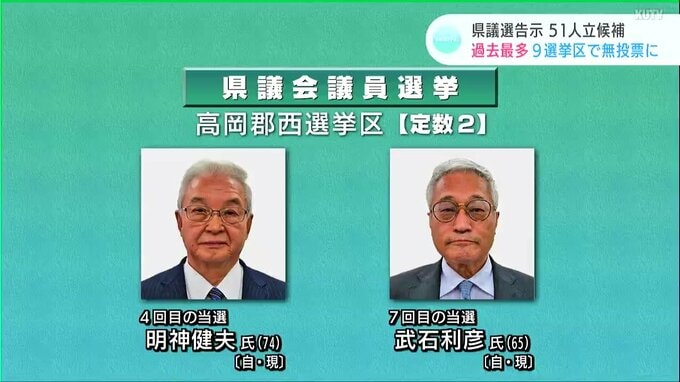 定数2の高岡郡西選挙区では自民党の現職、明神健夫(みょうじんたけお)さんが4回目の当選、自民党の現職、武石利彦(たけいしとしひこ)さんが7回目の当選です。