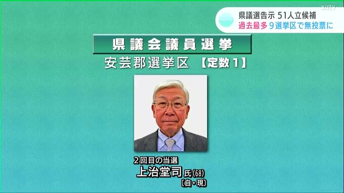 定数1の安芸郡選挙区では自民党の現職上治堂司(かみじたかし)さんが2回目の当選です。