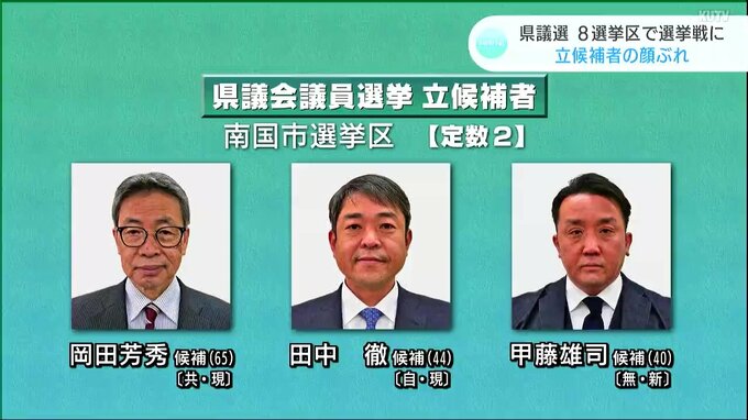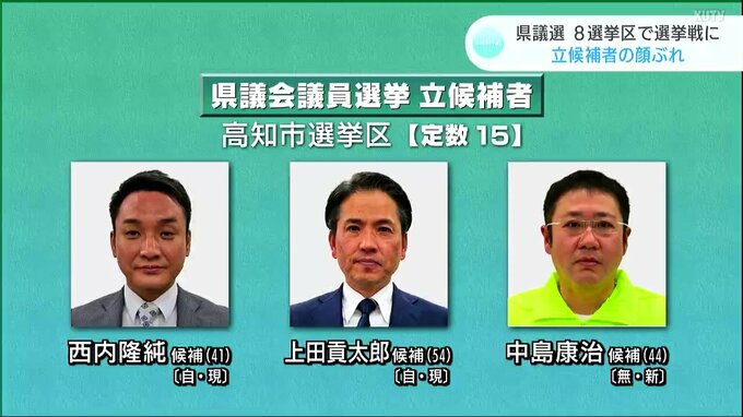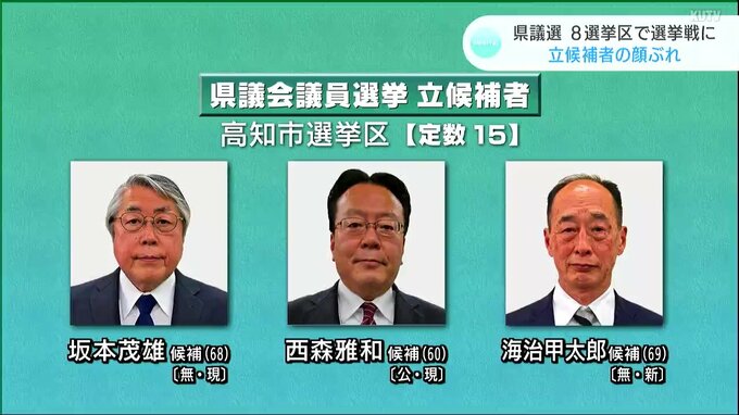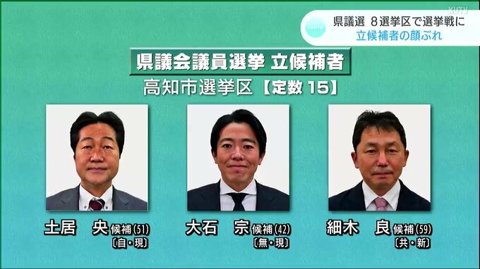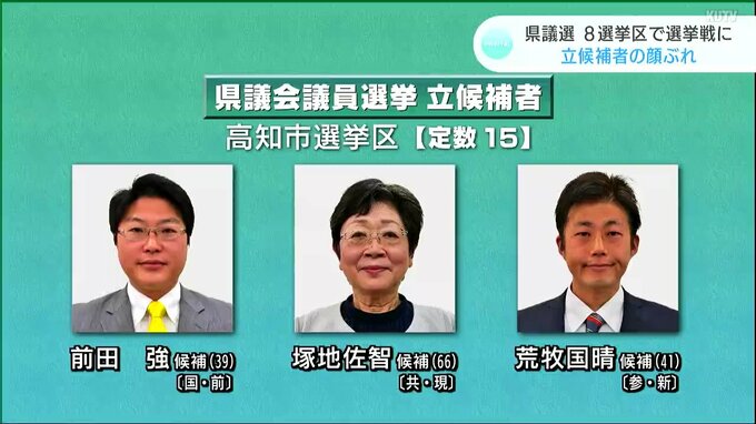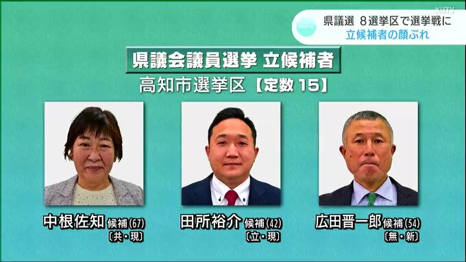 定数2の南国市選挙区は共産党の現職と自民党の現職、無所属の新人による3つどもえの選挙戦です。