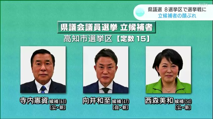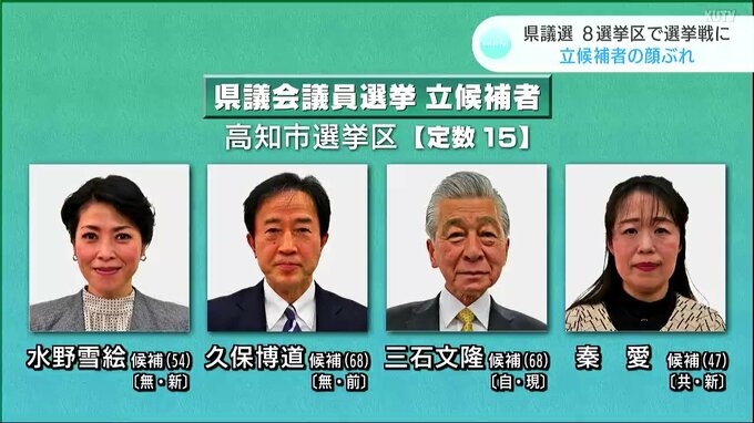党派別では自民党が5人、共産党が4人、公明党が3人、立憲民主党・国民民主党がそれぞれ1人、参政党が1人、無所属が7人です。22人の立候補者のうち、現職が10人、前議員が2人、新人が10人となっています。高知市選挙区に立候補した22人を届け出順に紹介しています。定数15に対し、22人が立候補していて、混戦が予想されます。