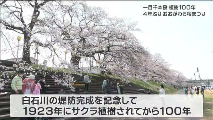 一目千本桜が咲き誇る宮城県大河原町の白石川沿いでは、31日から4年ぶりに桜まつりが始まり、大勢の人でにぎわいをみせています。