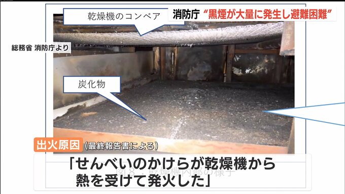 報告書の中で消防庁は「乾燥機から熱を受けてせんべいのかけらが発火した」ことを出火原因としました。