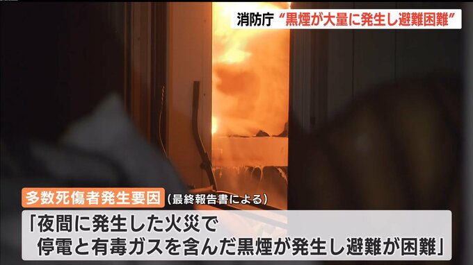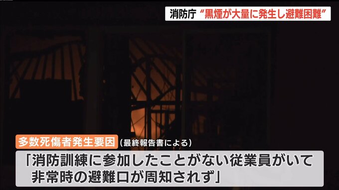 「夜間に発生した火災で、出火直後に停電が発生したほか、有毒ガスを含んだ黒煙が多量に発生し、避難が困難だった」点とあわせ、「消防訓練に参加したことがない従業員がいて、防火シャッターや非常時の避難口が周知されていなかったこと」が要因だと結論づけました。