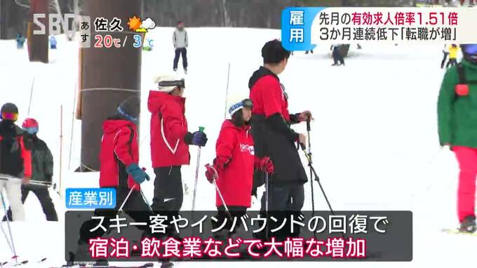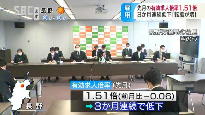 長野労働局によりますと、先月の有効求人倍率は1.51倍で、前の月を0.06ポイント下回り、3か月連続で低下しました。