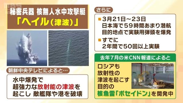 ーーこんなものを使っているという報道があります。秘密兵器「核無人水中攻撃艇」というものです。「ヘイル」という名前で、朝鮮語で「津波」を意味する言葉です。朝鮮中央テレビによりますと、水中爆発で超強力な放射能の津波を起こし、敵艦隊や港を破壊する能力があるということです。さらに、3月21日から23日、日本海で59時間余り潜航後、港を想定した目的地点で実験用弾頭を水中爆発させたと。既に2年間で50回以上の実験をしているという報道もありました。去年7月のアメリカCNNの報道によりますと、ロシアも放射性の津波を起こす目的の核魚雷「ポセイドン」を開発中ということ。こういった話は以前からあったのでしょうか?