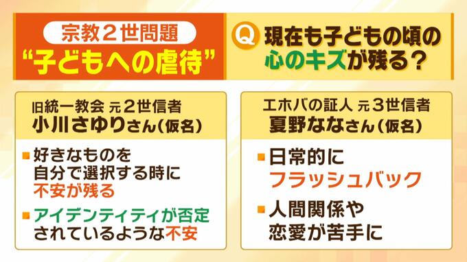 (小川さゆりさん・仮名)「私の場合は、20年間信じてきた教義を20年後に脱会して生きていこうと決めたんですけども、そうなると教えられてきたもの、そもそも価値として教義が根付いていたので、その価値がもうなくなってしまうっていうことは、自分で今何のために生きてるんだろうとか、自分って何が好きなんだろうとか自分のしている行動も何か罪悪感を感じてしまって、真理って何なんだろう?本当のことって何なんだろう?とかも不安がつきまとってしまうということはたくさんあります」
