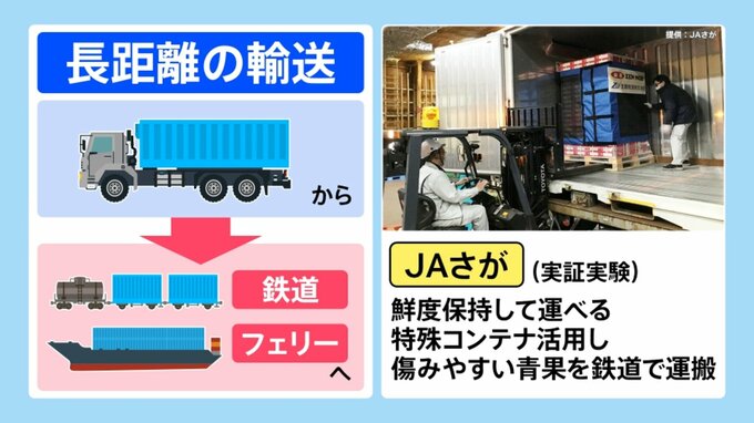 トラックだけでなく、鉄道やフェリーで運ぶことにも期待がされています。ただ鉄道やフェリーは、トラックに比べて時間がかかる傾向にあるそうで「鮮度を保持して運べる特殊コンテナを活用し、傷みやすい青果を鉄道で運搬」などが期待されていて、実証実験が行われているということです。