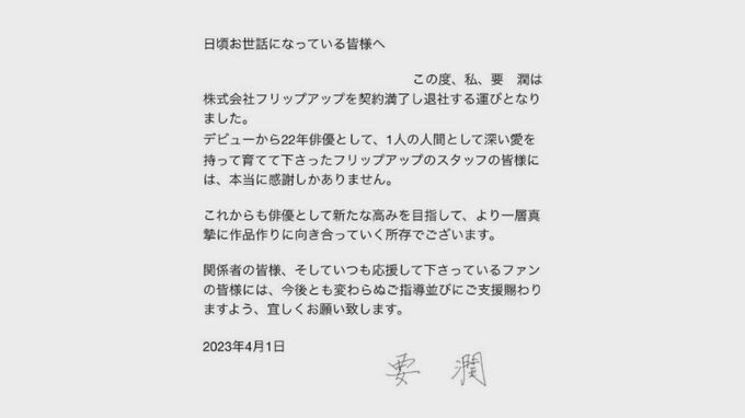 この度、私、要 潤は株式会社フリップアップを契約満了し退社する運びとなりました。デビューから22年俳優として、1人の人間として深い愛を持って育てて下さったフリップアップのスタッフの皆様には、本当に感謝しかありません。