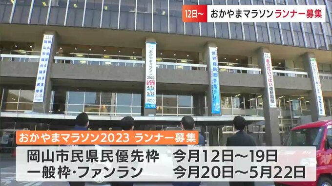「おかやまマラソン2023」のランナー募集が始まるのを前に、開催を知らせる懸垂幕が岡山市役所に掲げられました。岡山市役所にお目見えした縦6.5メートルの懸垂幕です。おかやまマラソンの市民県民優先枠のランナ…