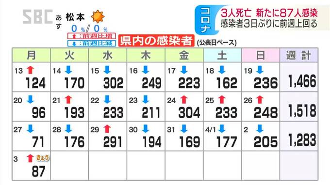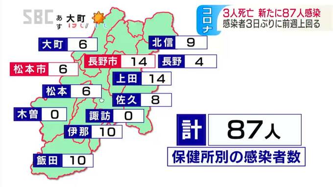 長野県内では3日、新型コロナウイルスに感染した3人の死亡と87人の感染が新たに確認されました。