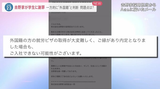 5月1日、吉野家の会社説明会に応募したところ“外国籍”であることを理由に参加を断られました。吉野家から届いたメールには・・・